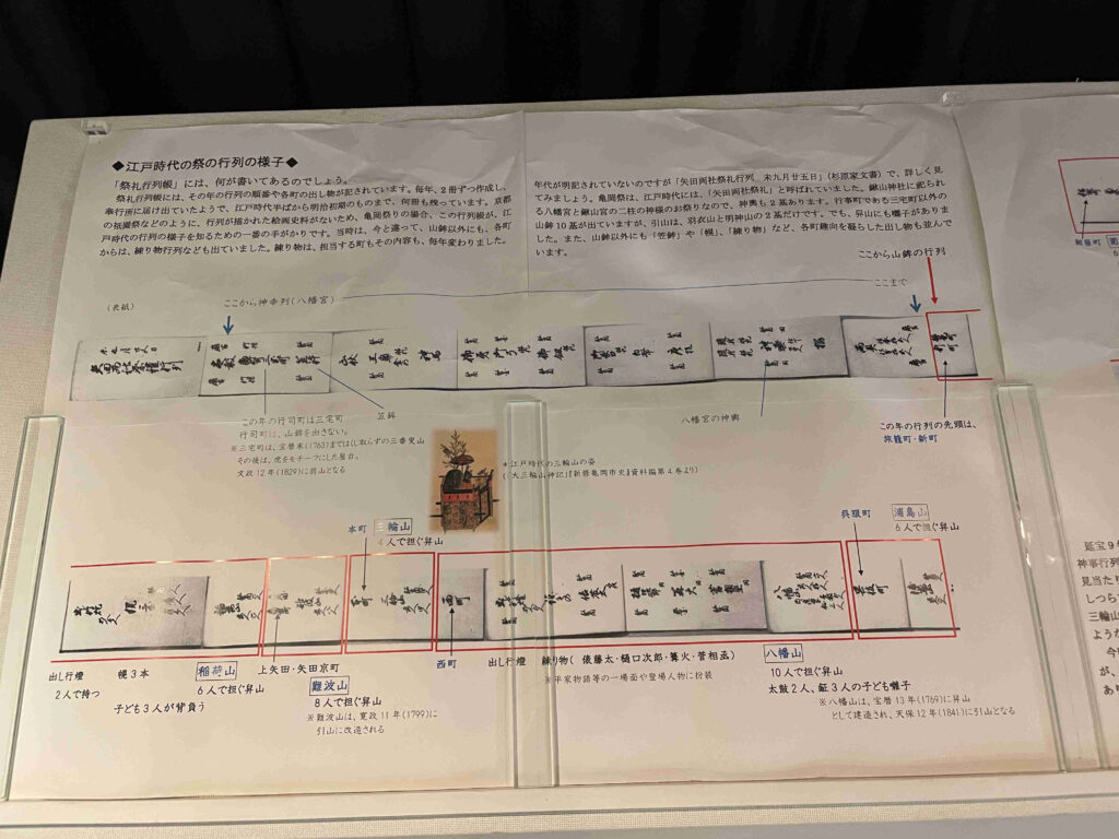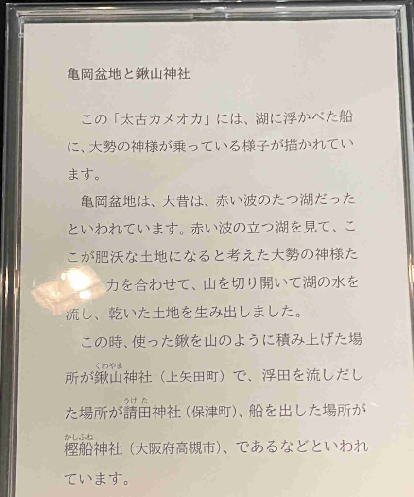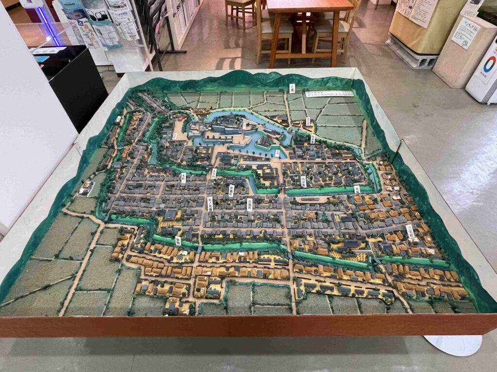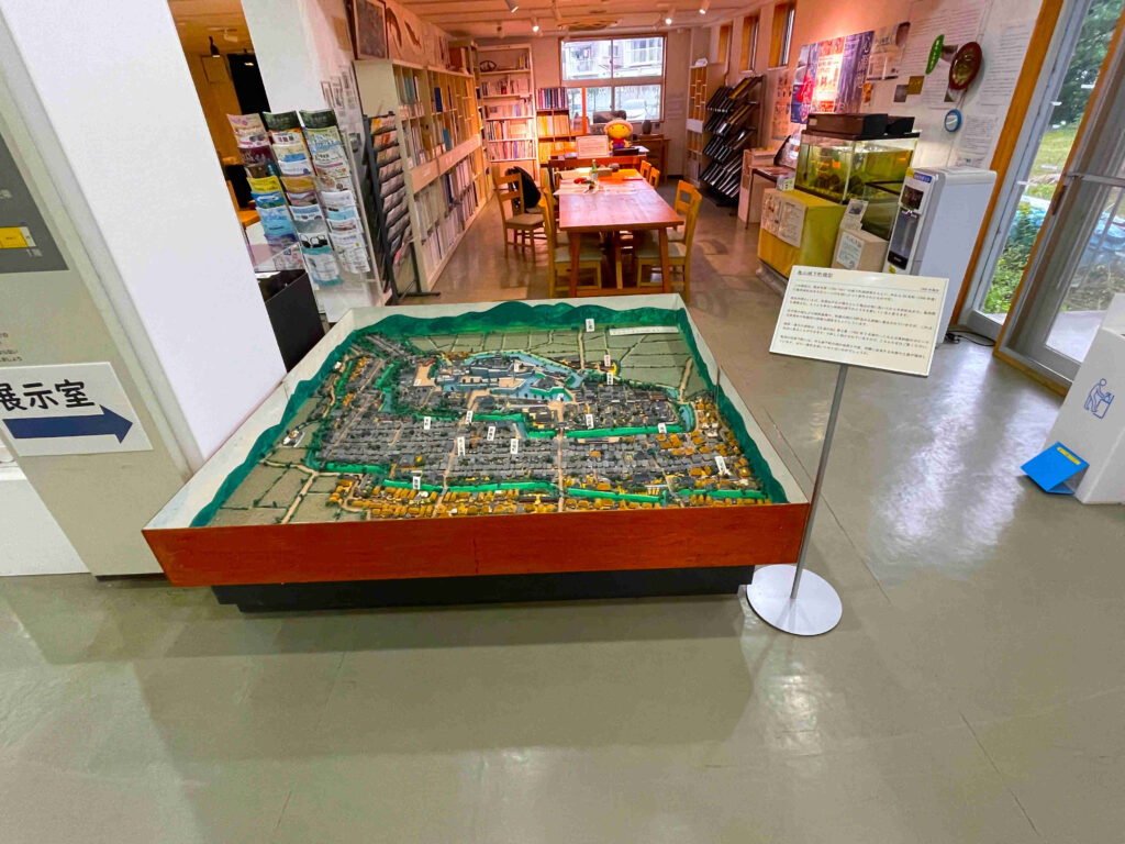 図10, 11は亀山城下町の様子だ。地形の起伏が無視されていて,残念なことだ。DEMでモデルを整形出力して,その上に建物などを配置すれば,より良いものになるのであるが。漫画的ジオラマにあたる。歴史や考古のスタッフでは限界がある。図10の後背のテーブルスペースが来館者の学習の場として提供されている。亀岡市立図書館もそうだが,点照明が鬱陶しい。長い蛍光管で面的に照明すれば,作業がやりやすいと思うが。そういう発想が亀岡市では脱落していると感じる。