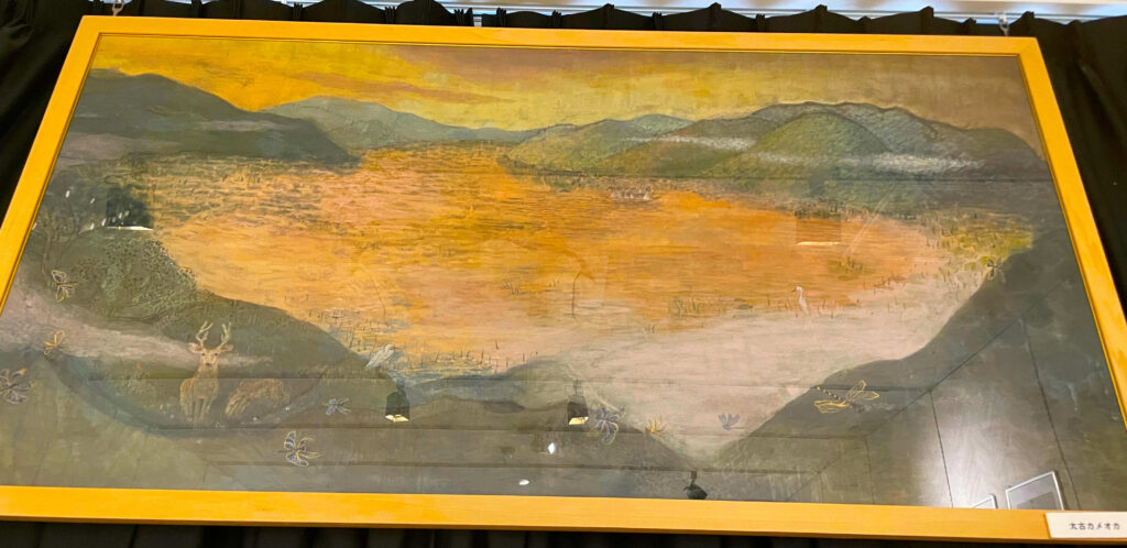 丹の海の再現図である。画家(女性)の名前が画像では読めない。忘れた。次回,見直そう。人の侵入前の時代のものにあたるかどうか。