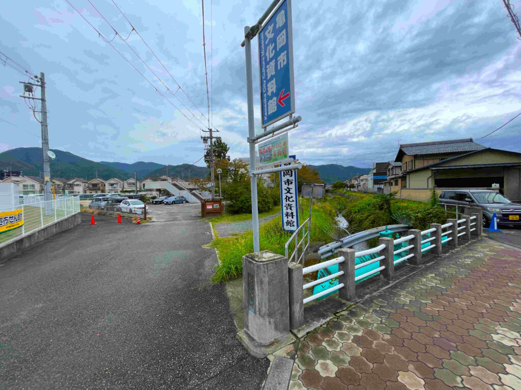 図4は,入り口の景観である。左手奥にには牛松山。建物は案内板後背なのであるが。この橋は雑水川にかかる。資料館はこの川そばにあって,保津川の溢水でかつては床上浸水があった場所である。資料保管場所としては不適切な場所と言えだろう。