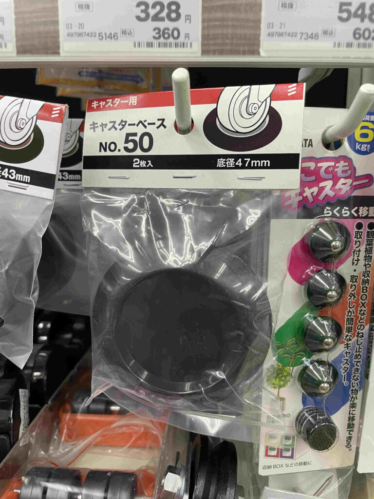 追記 2026年4月9日: キャスターのベースとして図2のものは小さくて,キャスターの外径に満たない。使えないことはない。畳に仮置きする場合には何とか使用可能だろう。ラック一台に4個が必要なので,あと1製品買って4個にする。ただ,製品自体の購入は中止だ。アマゾンで検索したが,図1のコーナンの製品は180円/個,と比べて,より上質に見える「キャスターストッパー 4個セット ゴム製 キャスター椅子 滑り止め 固定 静音 振動吸収 キズ防止 車輪止め 家具 椅子 ソファ キャスター用の保護パッド ブラック」(699円)というのがあったが,クチコミによると,「臭すぎる」というのが数件中2件あってぼくには耐え難いもの。これでコーナンの製品をまずは一つ,買ってみよう。考えてみると,百円ショップのものを追加購入する必要はない。