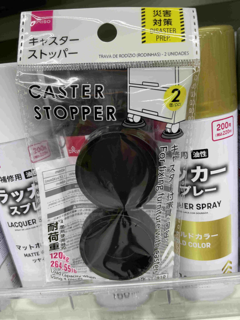 キャスターストッパーだけでは,床材への負担軽減にはつながらない。これを補助材に貼れば,キャスターを留めるだけでなく,床材への負担軽減にもなると考えた。図1はコーナンのもので,図2はその百円ショップである。前者についてはアマゾンの方が割安のものがあるが,図2ほど安いものはない。図2の説明では,4箇所に設置するとして耐荷重120kgとある。1個55円だから最も安い。まずはBuy 4,計8個を買ってみようと思う。
